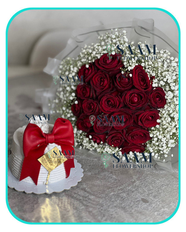 پکیج کاملا اقتصادی دسته گل رز قرمز و ژیپسوفیلیا وکیک تولد 250 گرمی