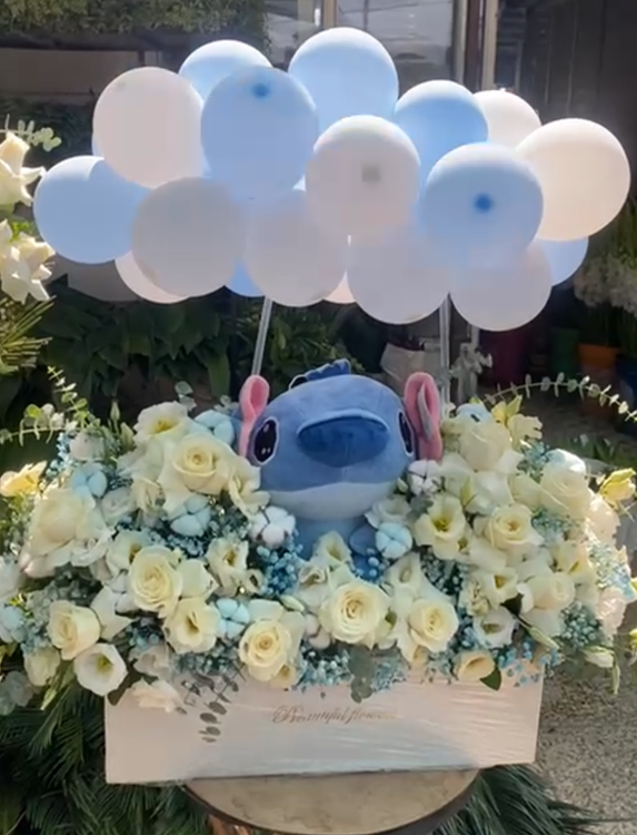 باکس گل بزرگ مناسب تولد نوزاد پسر همراه با بادکنک ریسه ای و عروسک