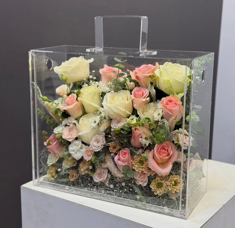 باکس گل از جنس پلکسی با طراحی کیف یا چمدون