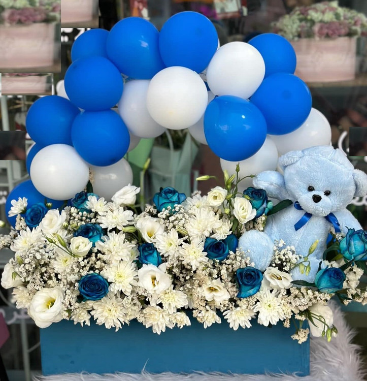 باکس گل بزرگ آبی مناسب برای تولد نوزاد پسر همراه با ریسه بادکنک آبی و عروسک تدی آبی