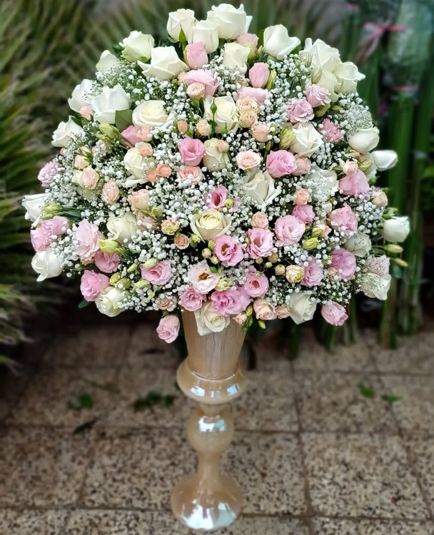 این جام گل خواستگاری ترکیبی از گل های رز سفید نباتی لیسینتوس صورتی سفید و عروس و ... میباشد