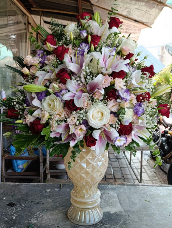 این جام گل خواستگاری ترکیبی از گل های رز سفید نباتی و قرمز لیلیوم صورتی سفید و عروس و ... میباشد