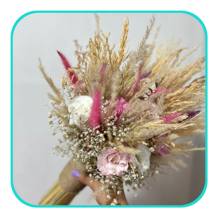 سام فلاور دسته گل فرمالیته عروس سبک بوهو که ترکیبی از گل های خشک و گل طبیعی تازه هست ، دسته گل عروس فرمالیته که معمولا رنگی انتخاب میشه برای عکاسی خیابانی و عکس های کلیپ عروس داماد آماده میشه ، دسته گل های فرمالیته معمولا بزرگتر از دسته گل های عروس انتخاب میشن