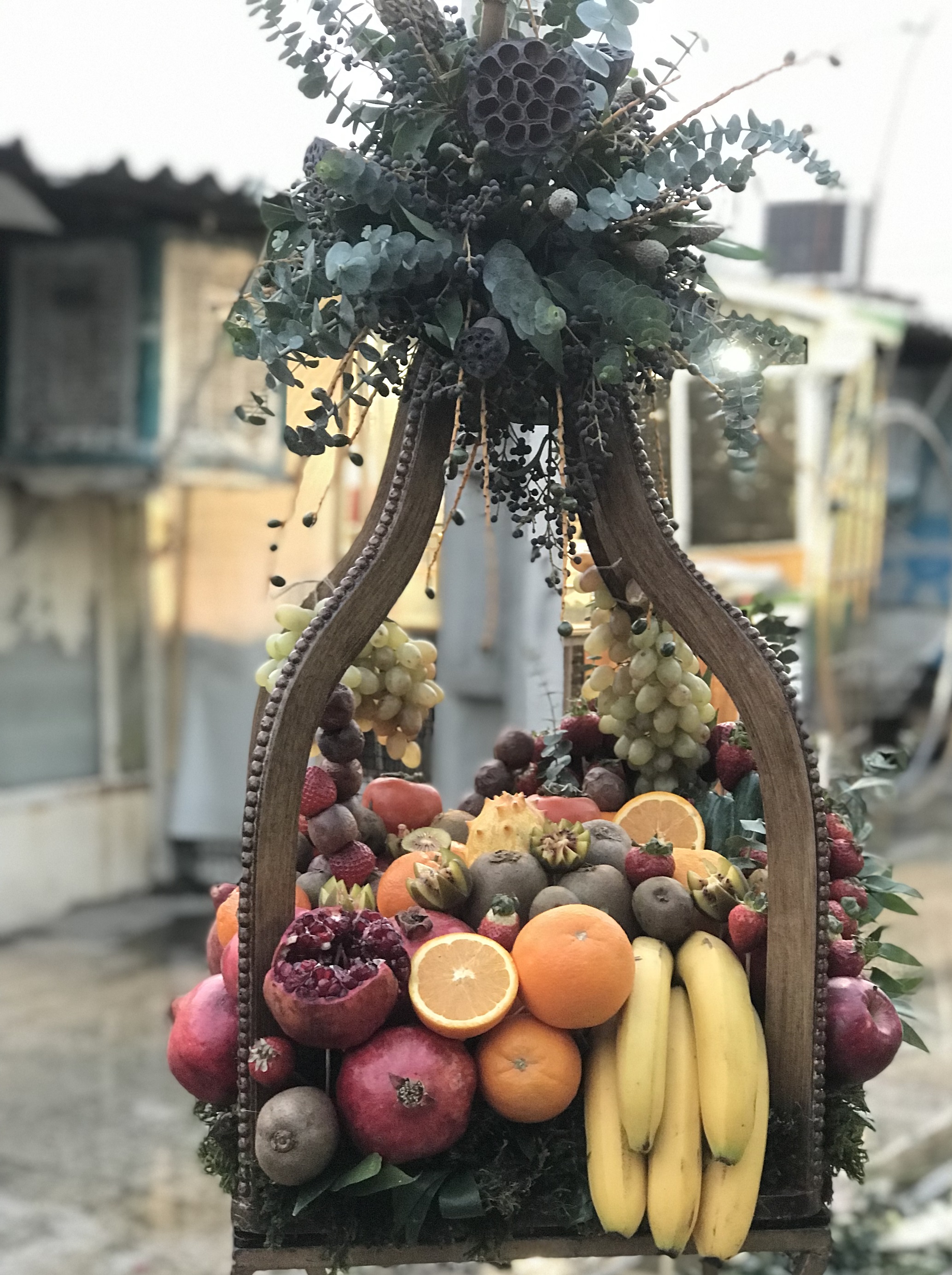 قفس چوبی با تزیین میوه همراه گل آرایی