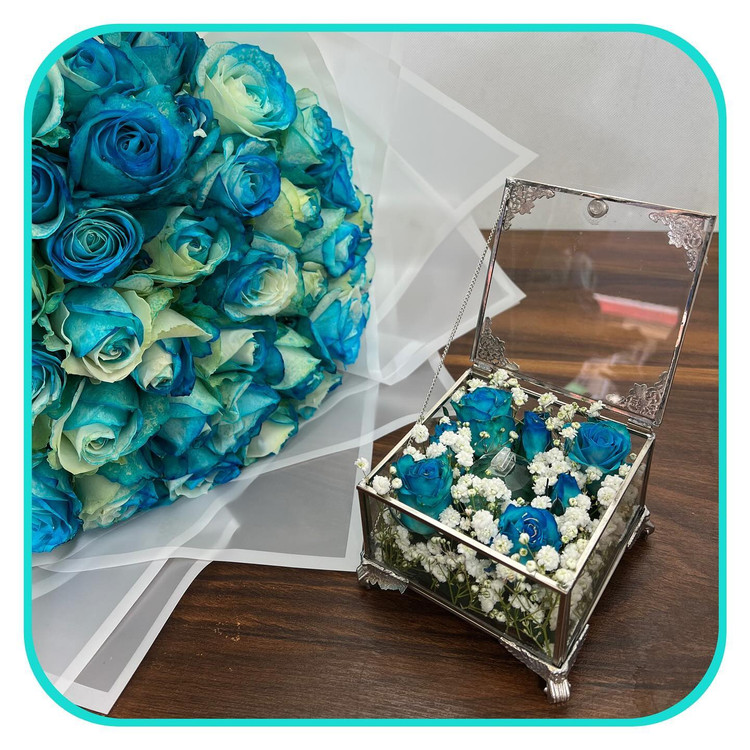 سام فلاور دسته گل خواستگاری آبی و خوشگل و شیک کنارشم جای حلقه ای تزیین شده با رز مینیاتوری آبی و ژیپسوفیلیا