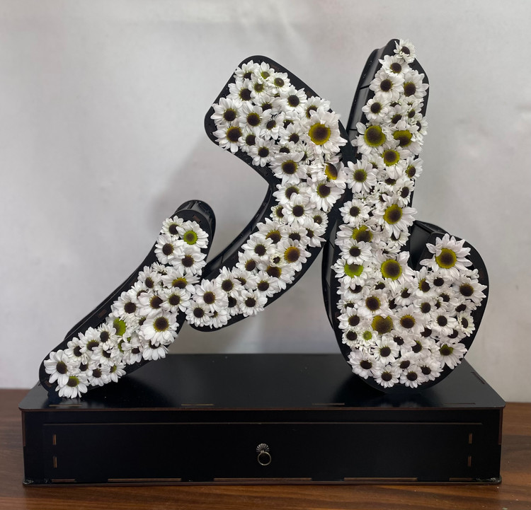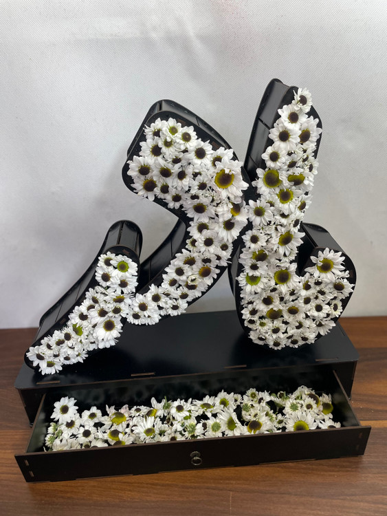 استند چوبی با طراحی نام مادر و گل آرایی با گل کرزنتیا سفید