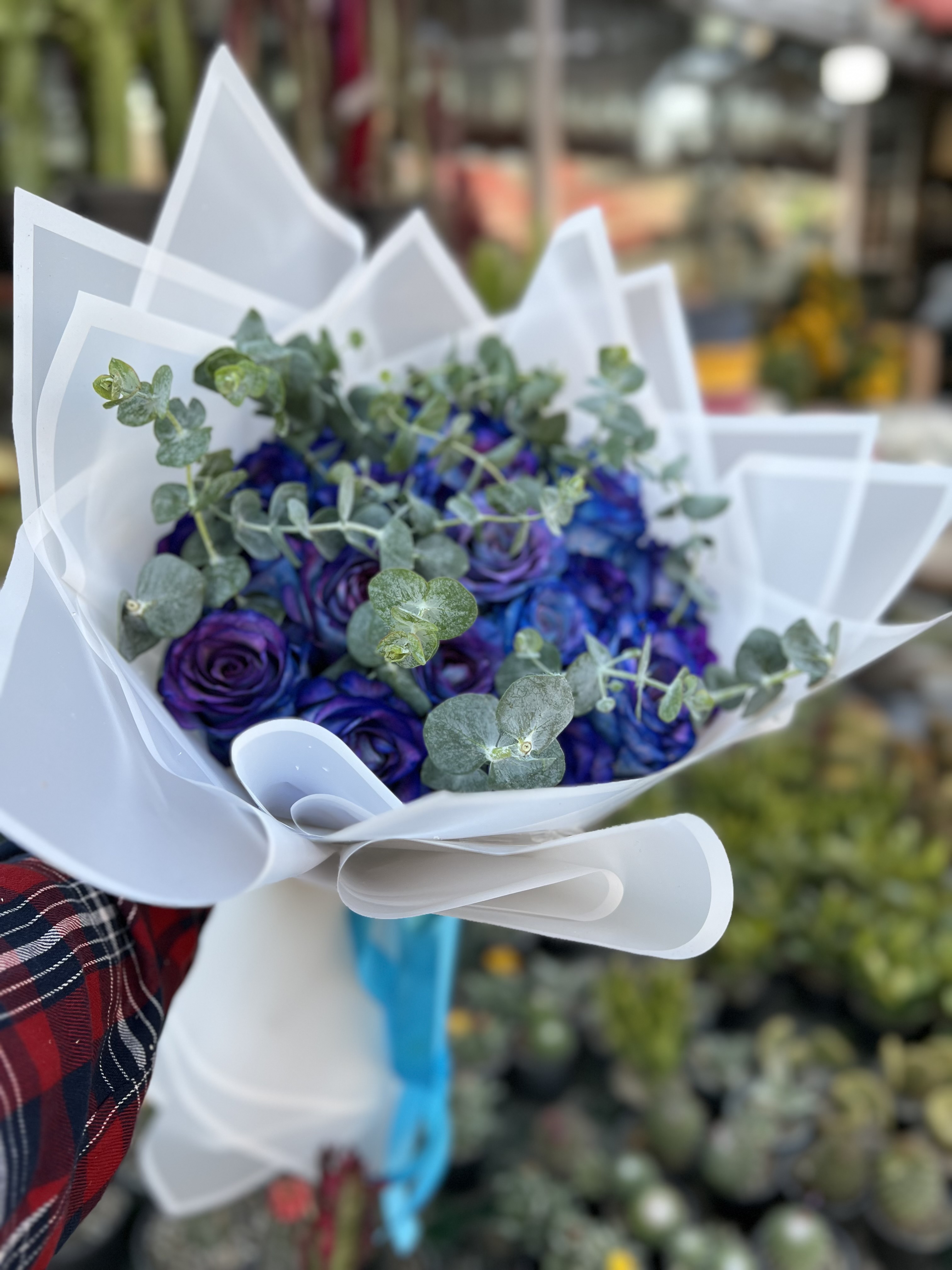دسته گل رز آبی 20 شاخه همراه با برگ گانیا یا همون اکالیپتوس