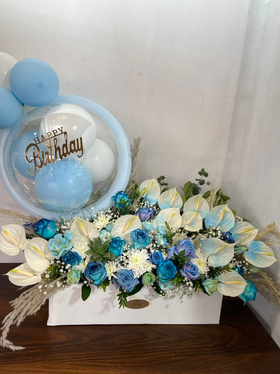 باکس گل بزرگ مناسب تولد نوزاد پسر همراه با بادکنک