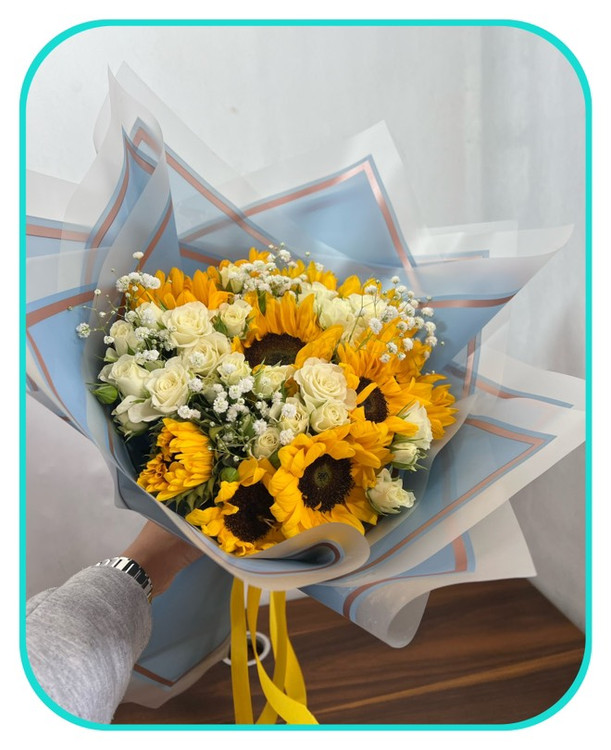 ترکیب گلآفتابگردون و رز مینیاتوری سفید