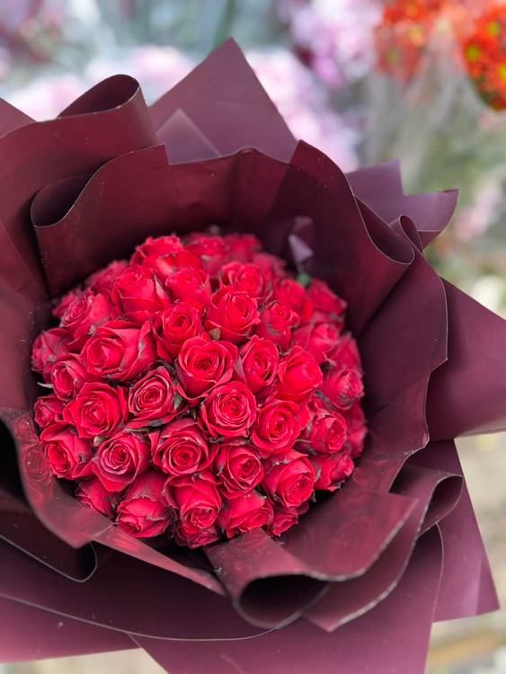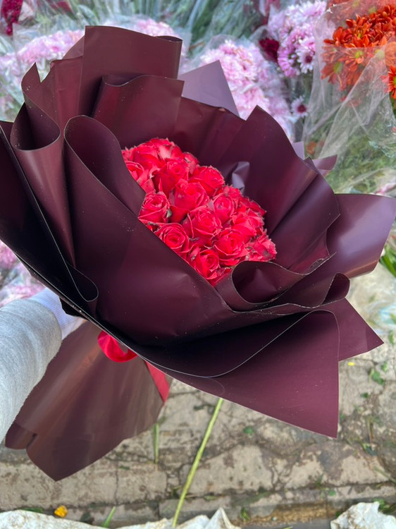دسته گل گرد رز با کاغذ پیچی زرشکی