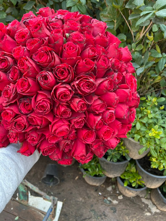 دسته گل گرد رز با کاغذ پیچی زرشکی