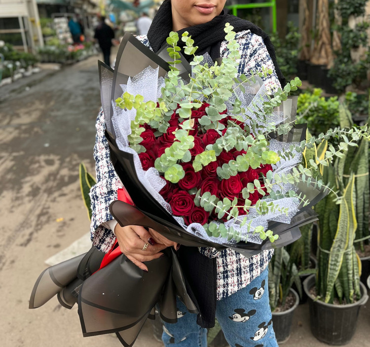 دسته گلرز قرمز 40 شاخه ترکیب با برگ گانیا یا اکالیپتوس