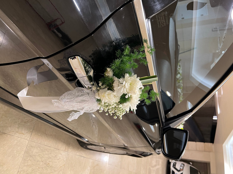 مدل ماشین عروس دنا سیاه ترکیب گل های استفاده شده داوودی سفید داوودی دکمه ای سبز و برگ و ژیپسوفیلا