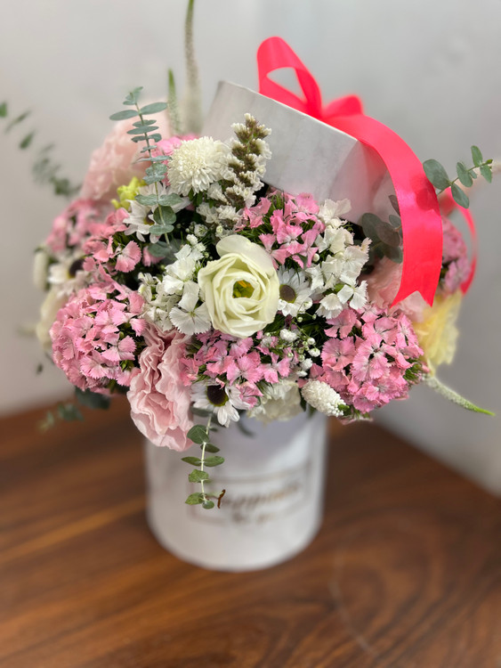 باکس گل سفید با ترکیب رنگ هاس سفید و صورتی مناسب تولد دخترونه ،دفاع دانشجو خانم