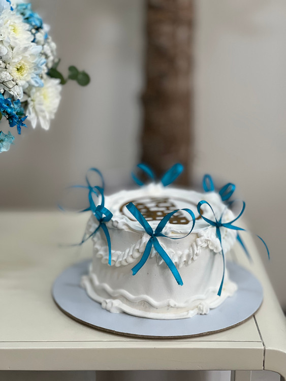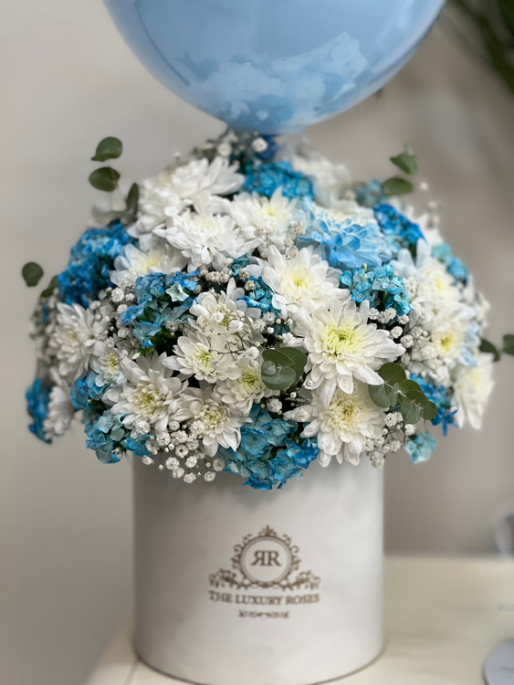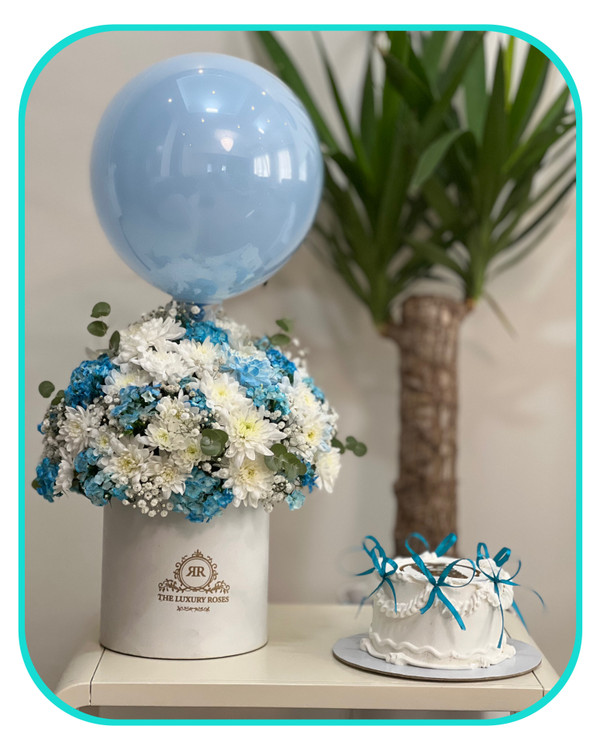 پکیج کاملا اقتصادی باکس گل و کیک تولد به همراه بادکنک آبی