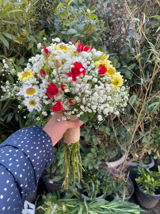 دسته گل عروس فرمالیته رنگی رنگی با گل عروس و رز مینیاتوری رنگارنگ
