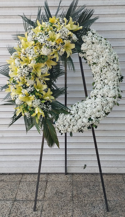 تاج گل با تم رنگی سفید و زرد برای غرفه نمایشگاه و افتتاحیه
