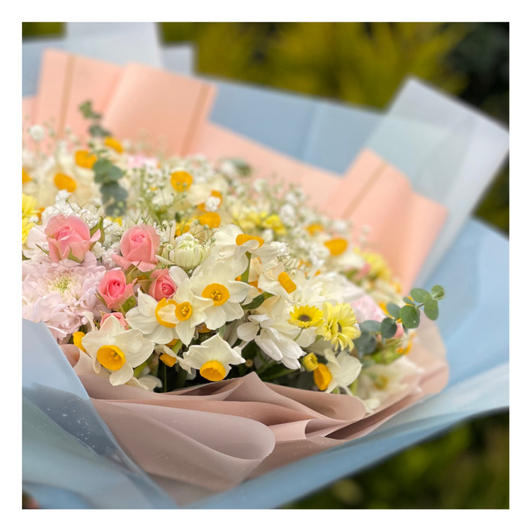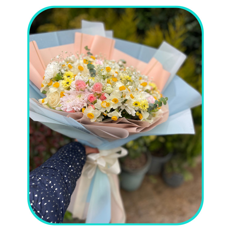 دسته گل ترکیبی سفید زرد صورتی سام فلاور