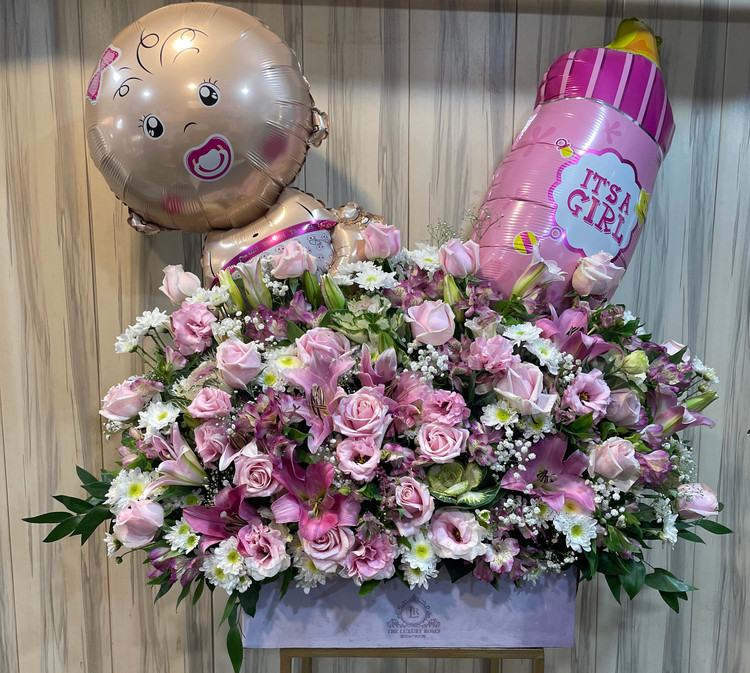 تزیین باکس گل نوزادی دیزاین شده با گل رز صورتی،لیلیوم صورتی و لیسین توس صورتی و گل ژیپسوفیلیا سفیدبا بادکنک های فویلی