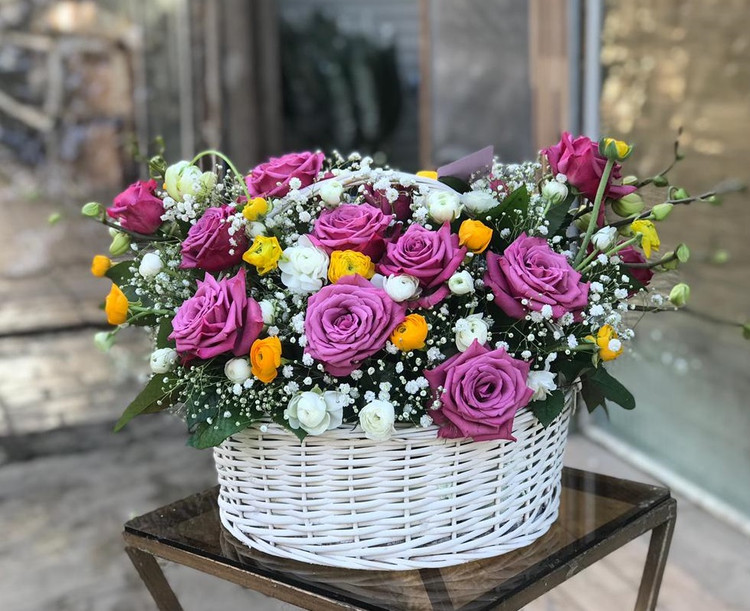 سبد گل سفید بزرگ با گل های رز یاسی و آنمون سفید و نارنجی