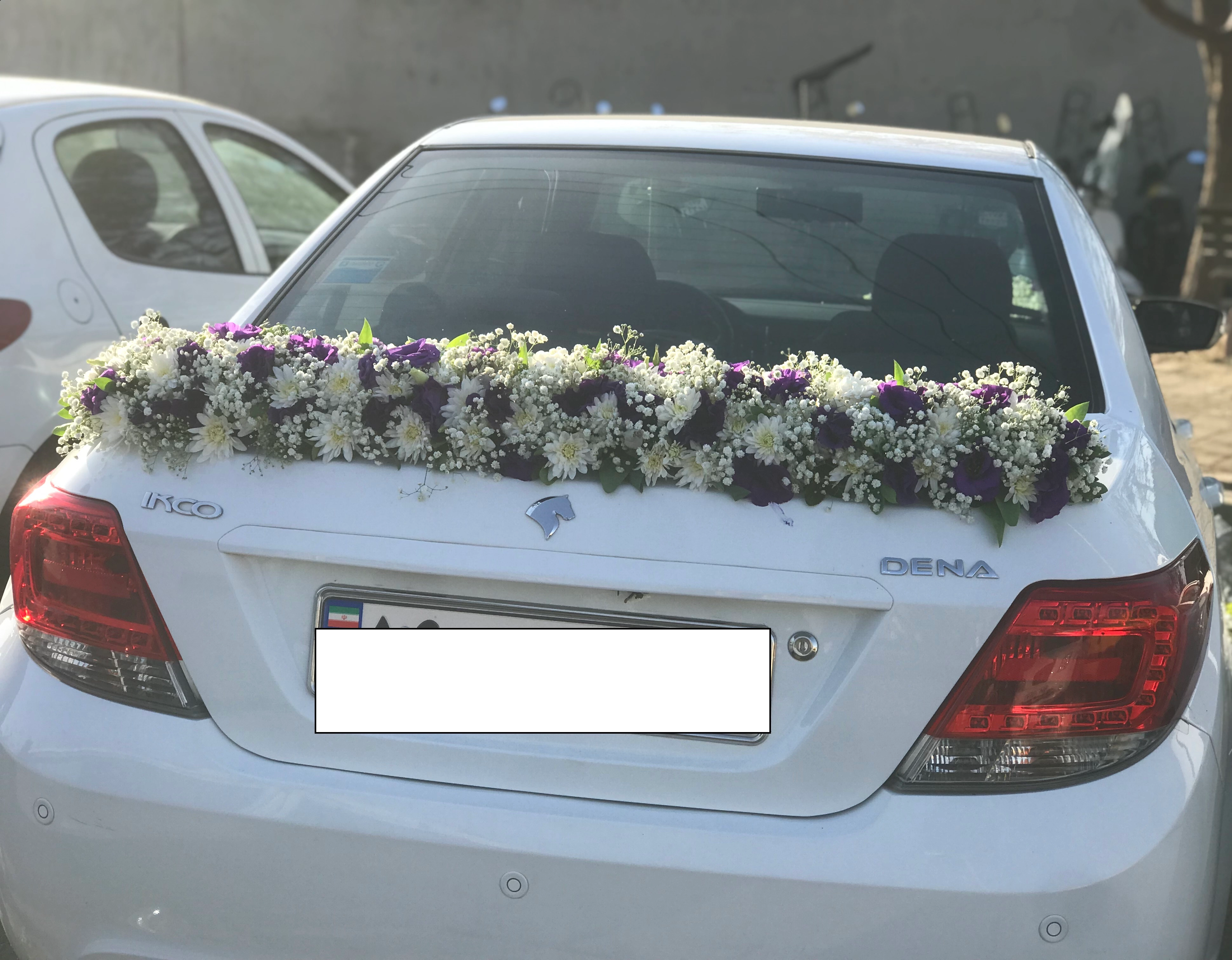 گل های استفاده شده در ماشین عروس دنا سفید گل های لیسین توس بنفش و داوودی سفید و ژیپسو
