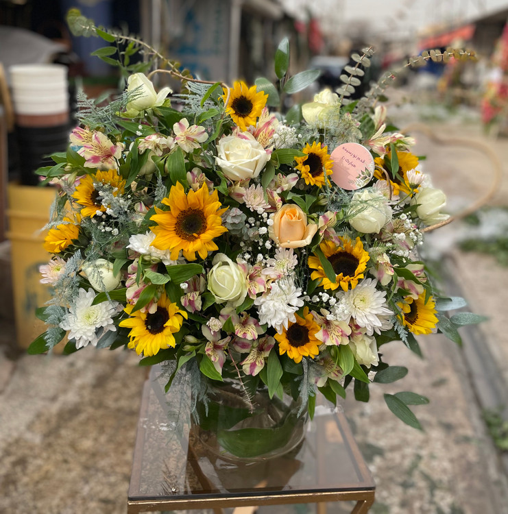 این باکس شیک با گل های آفتابگردون و رز های سفید و گلبهی