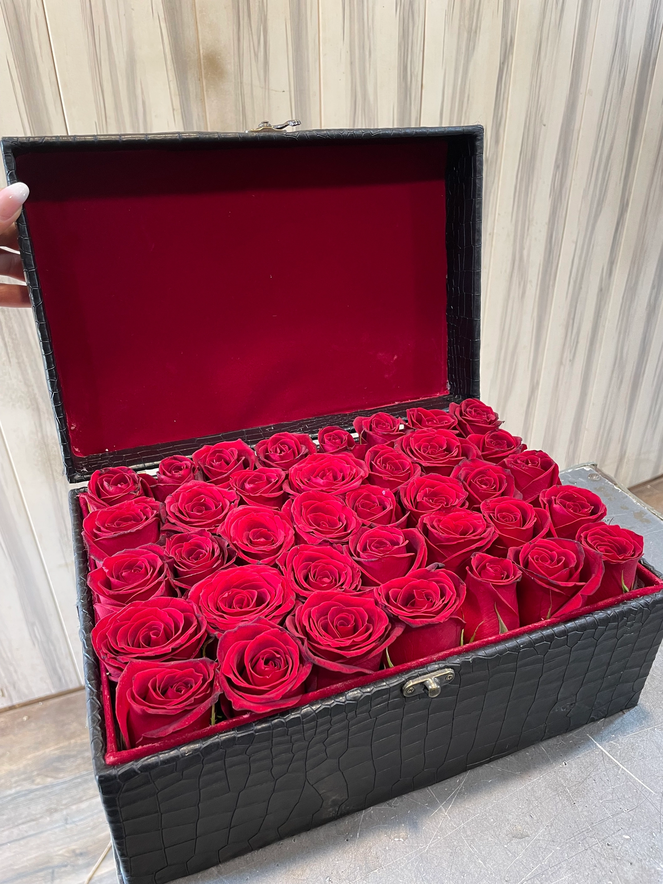صندوقچه چرمی دردار مشکی چرمی با 40 شاخه گل رز قرمز هلندی