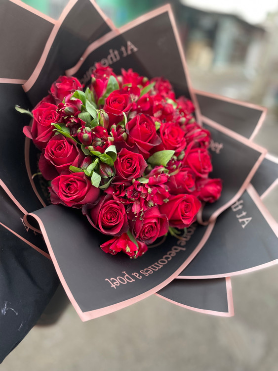 دسته گل رز قرمز هلندی 20 شاخه به همراه گل آلستر قرمز که اندازه متوسطی دارد