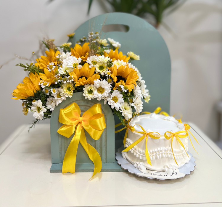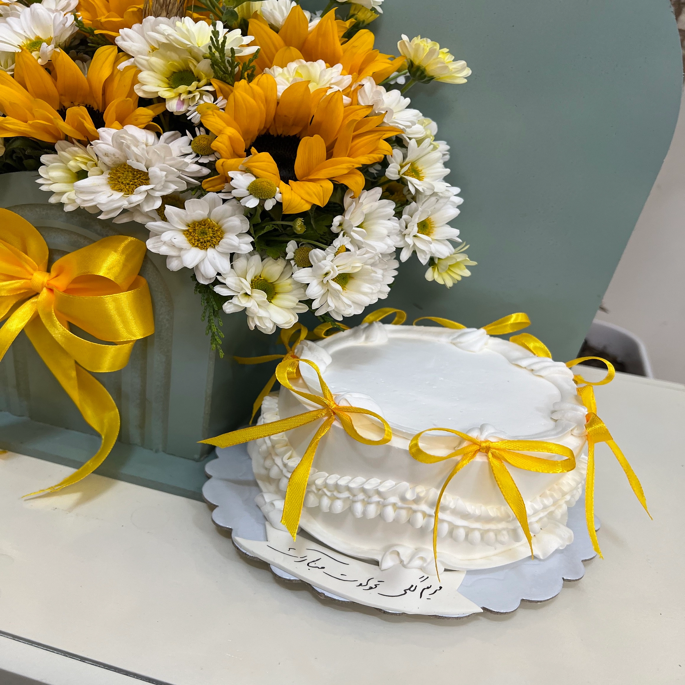 پکیج کاملا اقتصادی باکس گل آفتابگردون و بابونهو کیک تولد خامه ای تولد پاپیونی