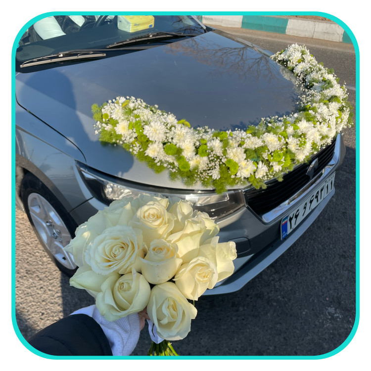 گل های استفاده شده در ماشین عروس دنا سفید گل هایداوودی سفید و سبز وژیپسو