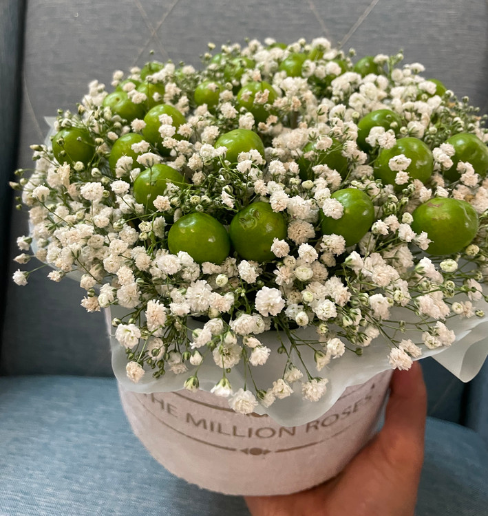 باکس گل با میوه گوجه سبز ترش و گل ژیپسوفلیا