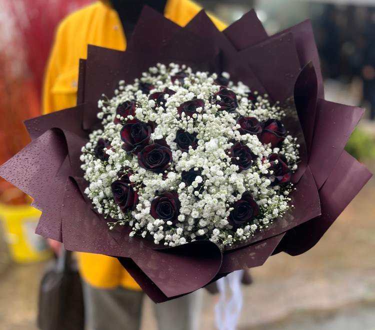 دسته گل رز هلندی 20 شاخه سیاه یا مشکی یا بلک همراه با گل ژیپسوفیلیا