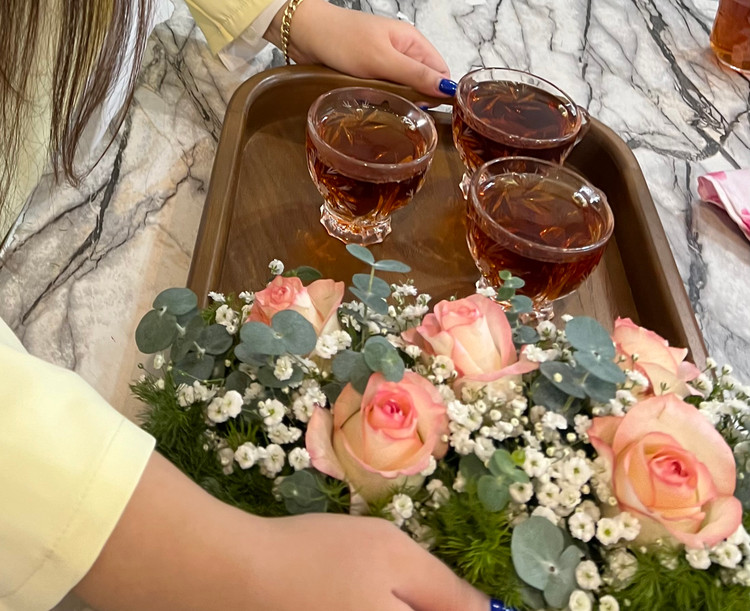 سینی چای خواستگاری گل آرایی شده با گل رز صورتی و عروس و برگ گانیا
