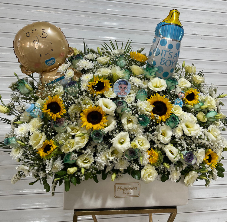 تزیین باکس گل نوزادی دیزاین شده با گل لیسین توس کرم ،آفتابگردون و داوودی ، گل ژیپسوفیلیا سفیدبا بادکنک های فویلی