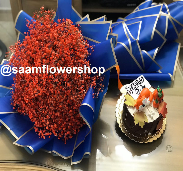 پکیج کاملا اقتصادی دسته گل ژیپسوفیلیا نارنجی و کیک تولد خامه ای250 گرمی