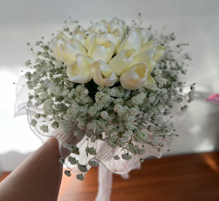 دسته گل عروس مصنوعی لاله سفید با ژیپسوفیلیا و تور