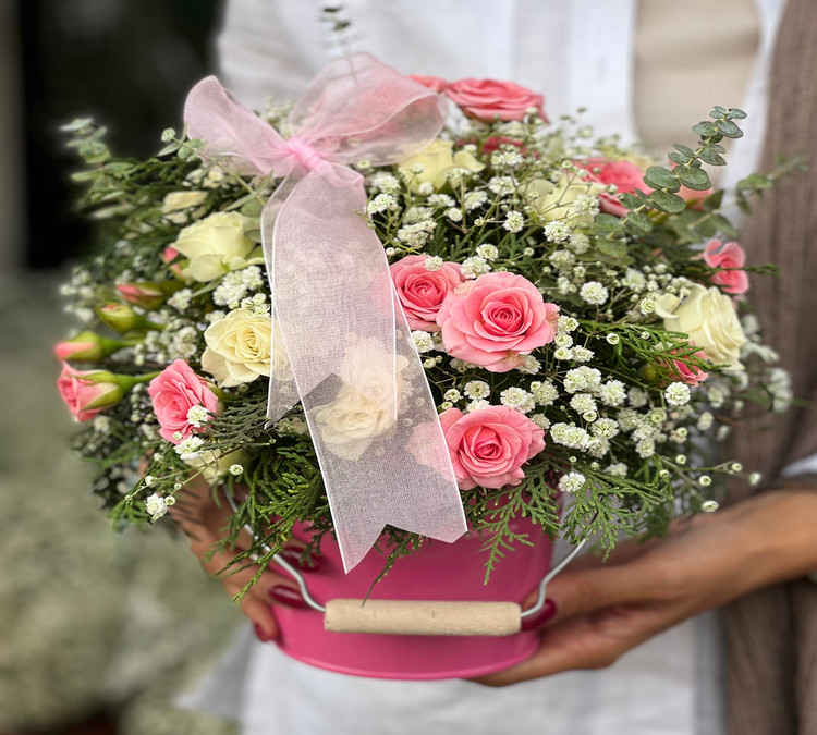 باکس گل فلزی دسته دار صورتی با گل های رز مینیاتوری و عروس