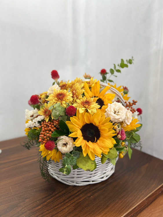 گل های استفاده شده در سبد گل سفید گل های رز مینیاتوری و آفتابگردان زرد میباشد