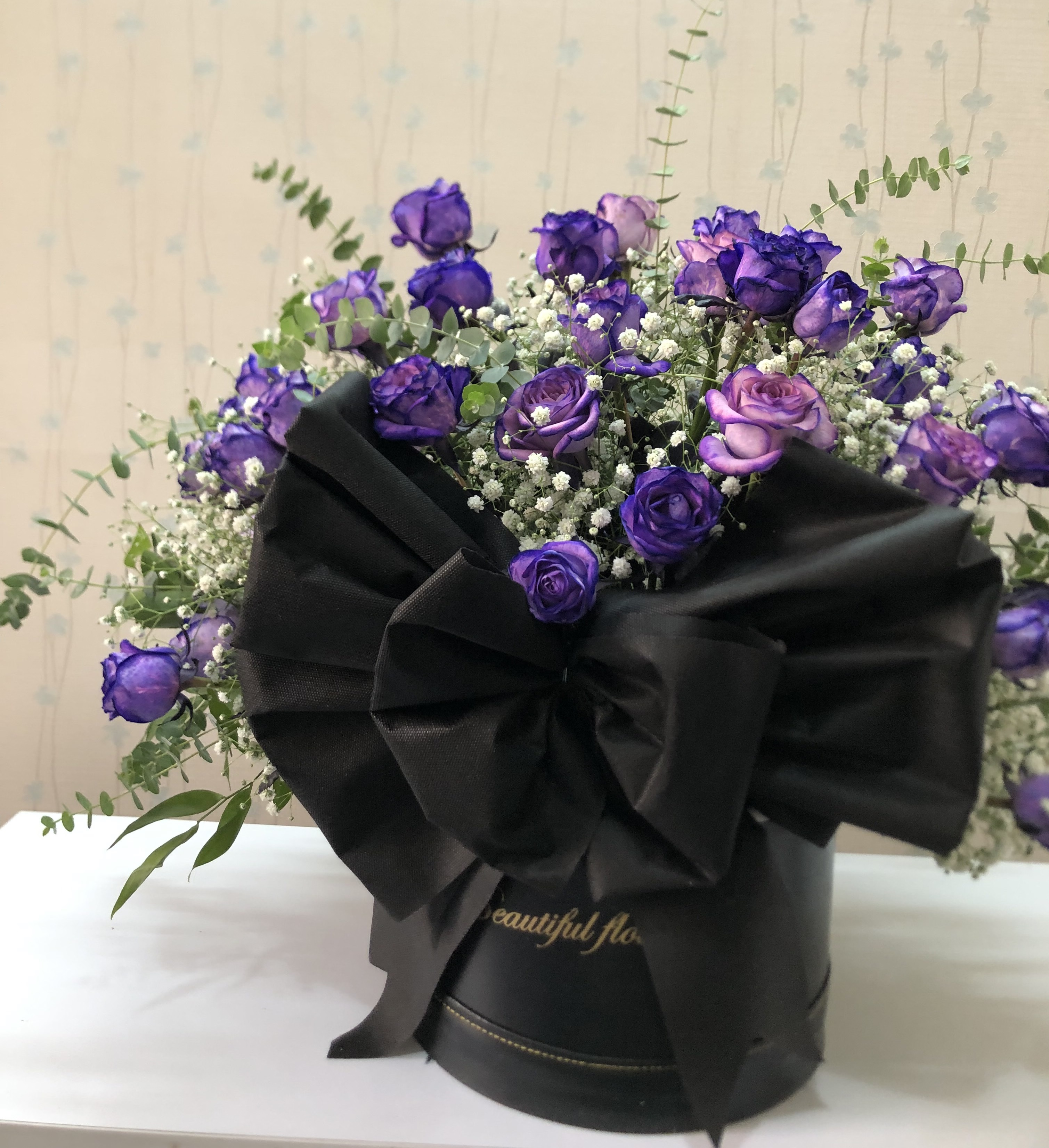 باکس گل رز بنفش هلندی 40 شاخه با پاپیون بزرگ مشکی
