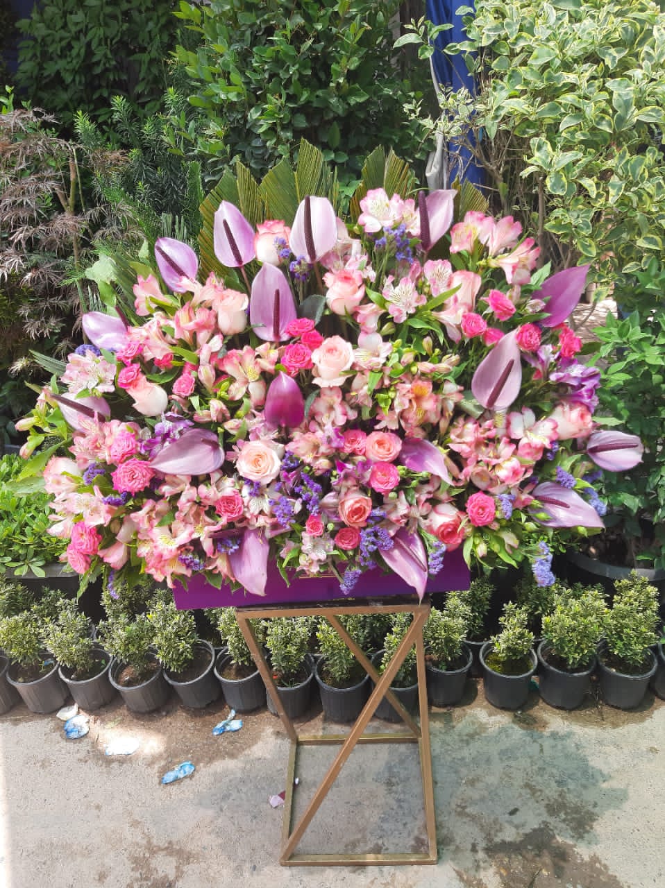 ترکیب گلهای رز مینیاتوری و رز صورتی و رز مینیاتوری آنتریوم بنفش