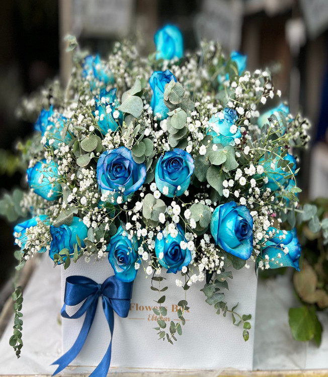 سبد گل یا باکس گل سفید با گل رز های آبی هلندی