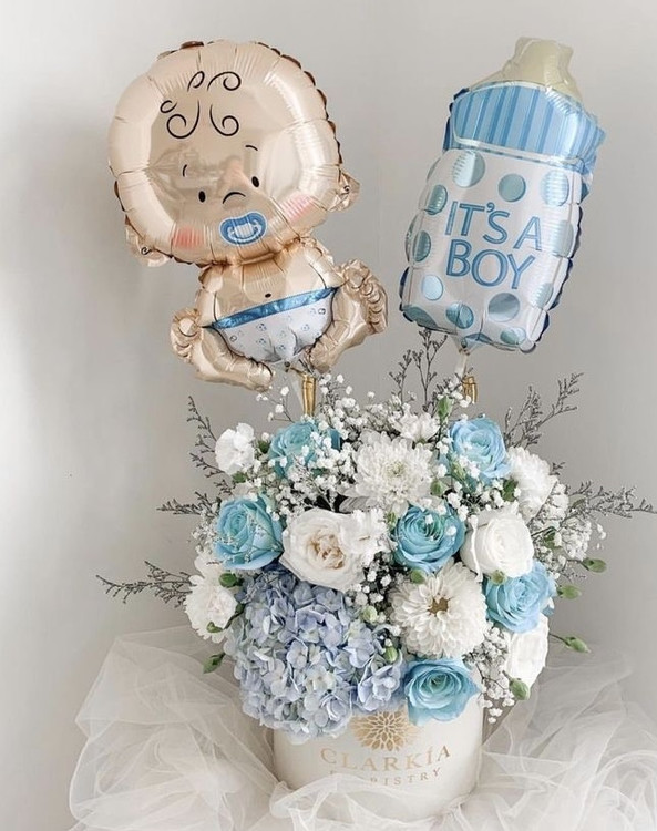تزیین باکس گل نوزادی دیزاین شده باگل رز هلندی آبی و هورتانسیا گل داوودی ، گل ژیپسوفیلیا سفیدبا بادکنک های فویلی