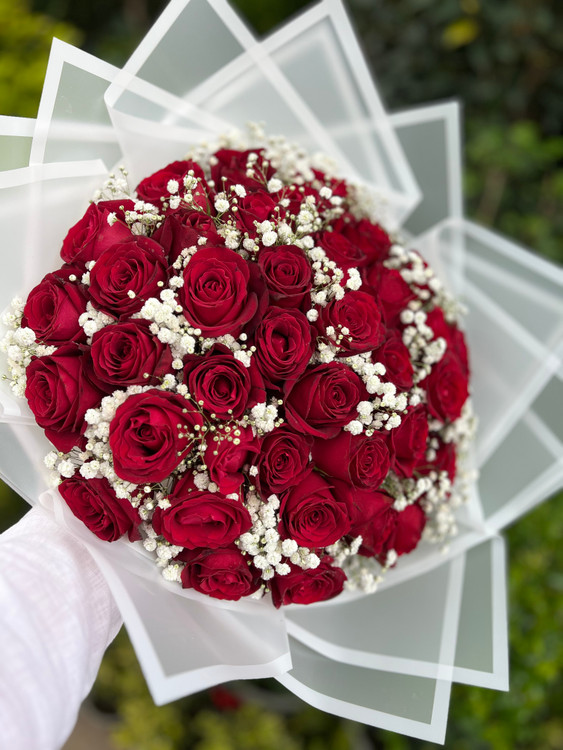 دسته گل رز قرمز هلندی 40 شاخه و گل عروس با کاغذ پیچی هفت و هشتی