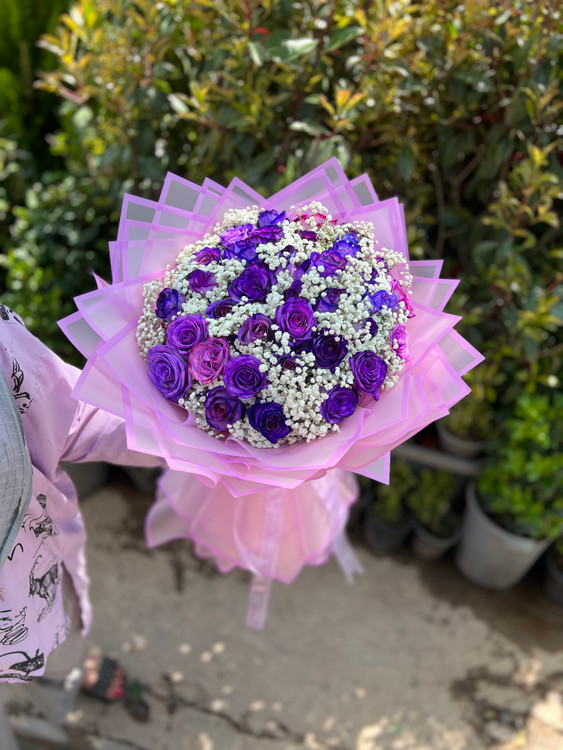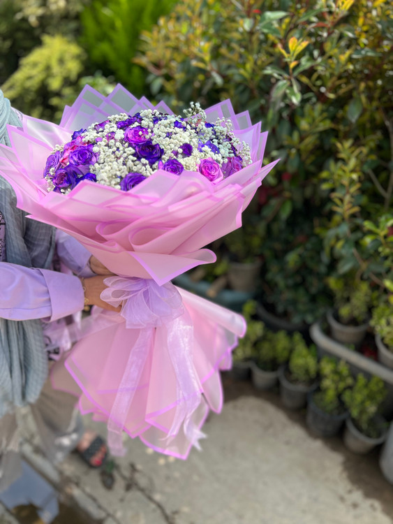 دسته گل بزرگ گل رز بنفش و ژیپسوفیلیا