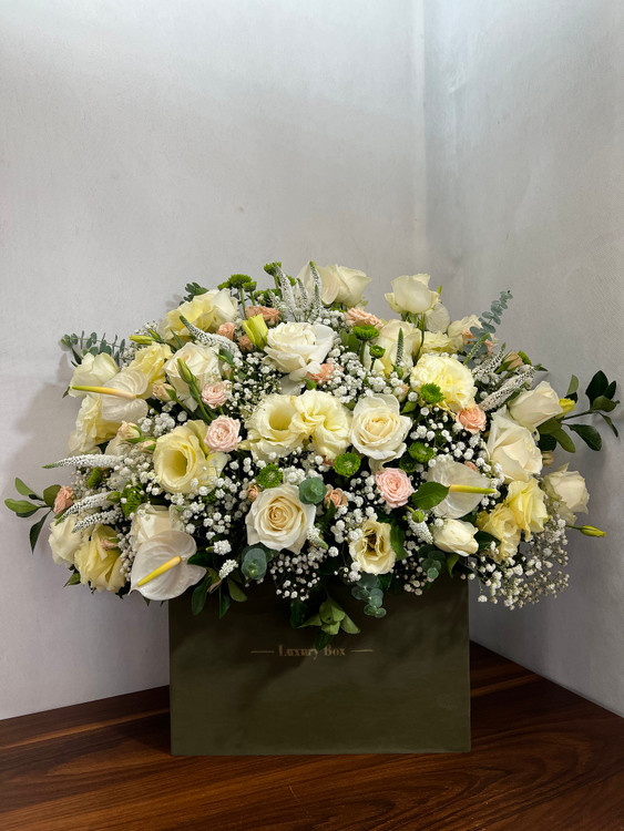 این باکس گل با رز سفید نباتی و لیسین توس کرم رز مینیاتوری گلبهی و ... تزیین شده است