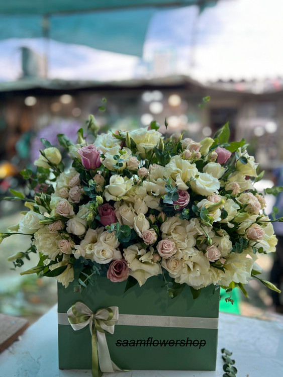 این باکس گل با رز سفید نباتی رز وینتیج و لیسین توس کرم رز مینیاتوری گلبهی و ... تزیین شده است