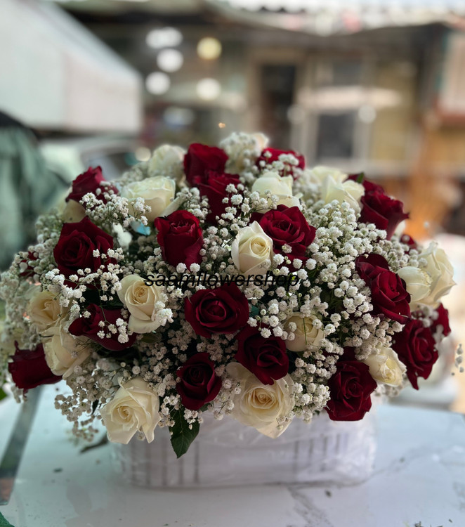 این باکس گل با رز سفید نباتی رز قرمز جمعا 40 عدد و ژیپسوفیلیا دیزاین شده است