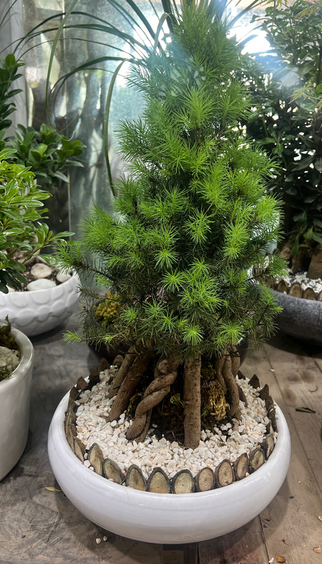 بونسای کاج سوزنی در گلدان سفید سرامیکی