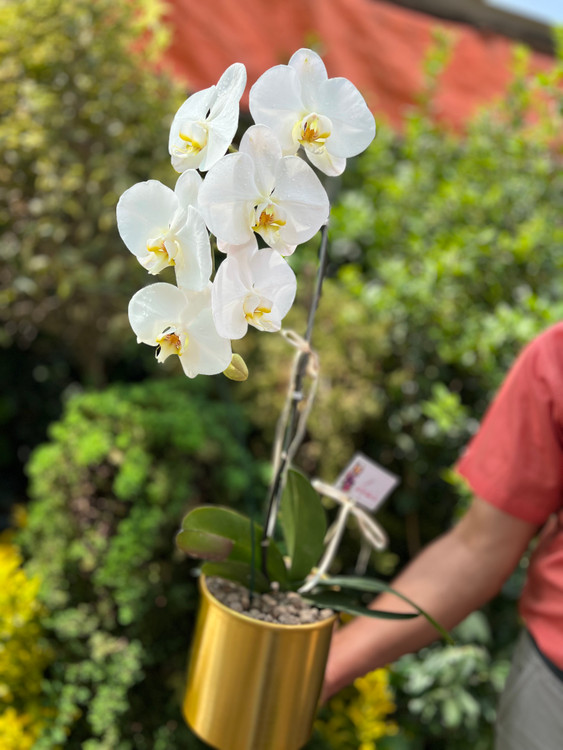 خرید گلدون ارکیده سفید طبیعی با گلدون طلایی فلزی