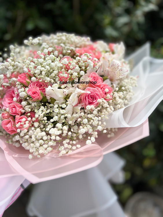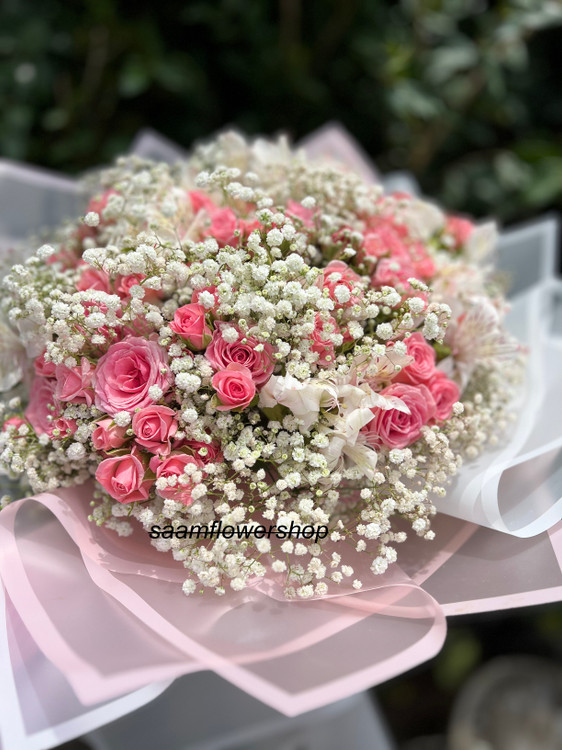 با رز های مینیاتوری و ژیپسوفیلیا سفید و آلستر سفید